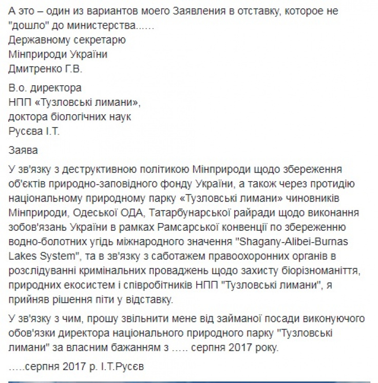 Как сообщает Depo.Одесса, о своем возвращении из отпуска на должность руководителя Национального парка "Тузловськие лиманы" Иван Русєв написал на своей странице в Facebook.