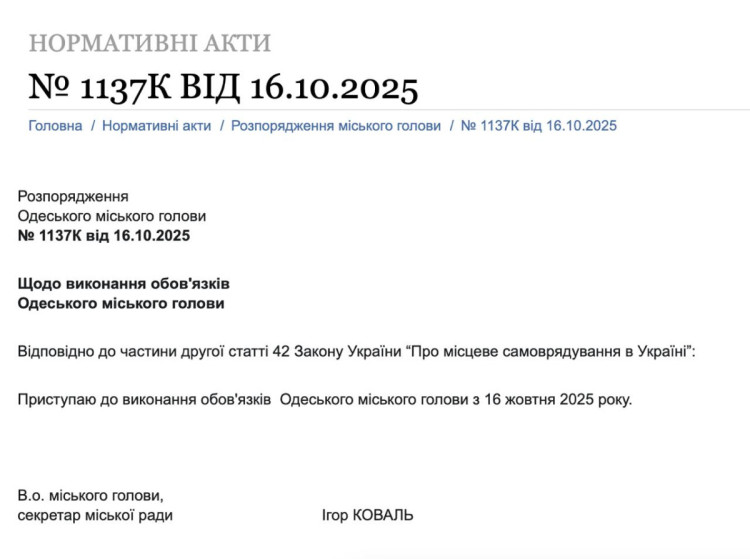 Обовʼязки міського голови Одеси з 16 жовтня виконує секретар Одеської міської ради Ігор Коваль